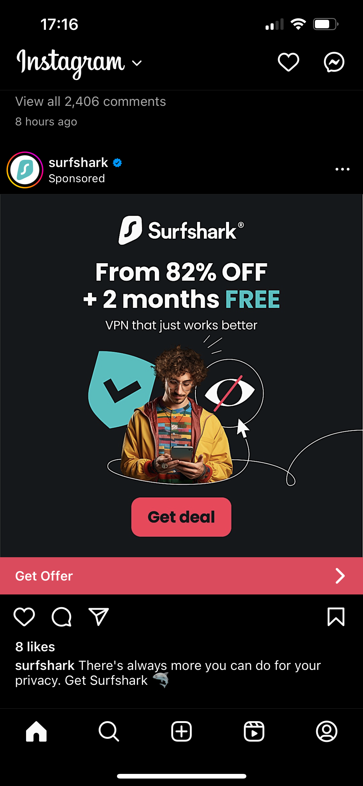 4:00 p.m. – Sitting at my desk, I start my homework and search for information on what services collect data, which means algorithms will probably send me ads about VPNs or cyber security similar to previous days ago. For example, an advertisement for Surfshark popped onto my Instagram feed an hour later.